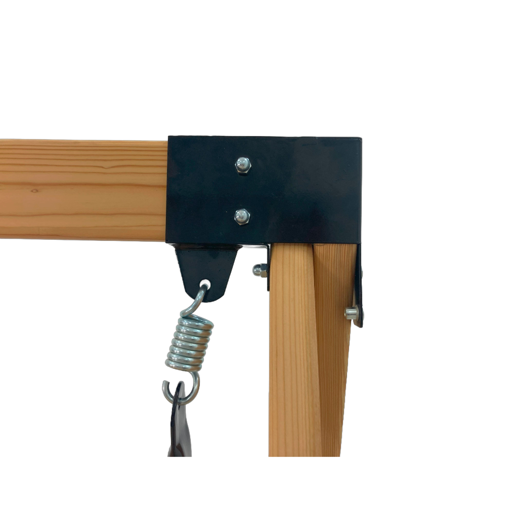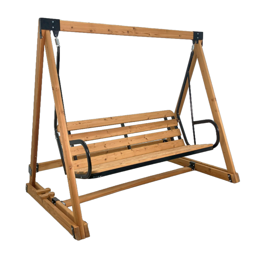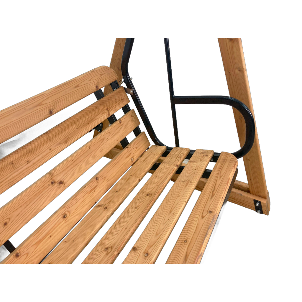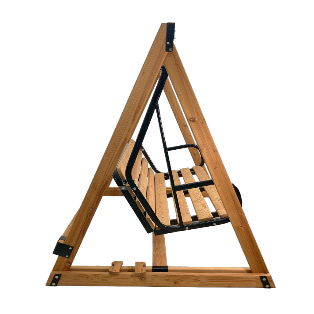 2. Сочетание дерева и металла, которое позволяет усовершенствовать жесткость скамьи. Например, наличие кронштейнов на перекладине существенно увеличивает прочность соединения стоек и позволяет выдерживать большую нагрузку на подвижную часть качелей. Также использование металлических соединений упрощает сборку качелей.